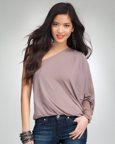 Perforated faux suede sleeve action, asymmetric neckline and ultra-soft wear make this bebe top a hot way to amp things up. Style it with metallic denim and oversized hoops for maximum edge. Offers hidden 10" zipper sleeve and elastic detail at hip for extra drape. 22" measurement from shoulder.